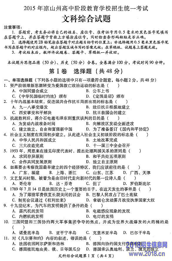 2015年四川省凉山州中考文综(历史部分)试题(扫描版,含答案)