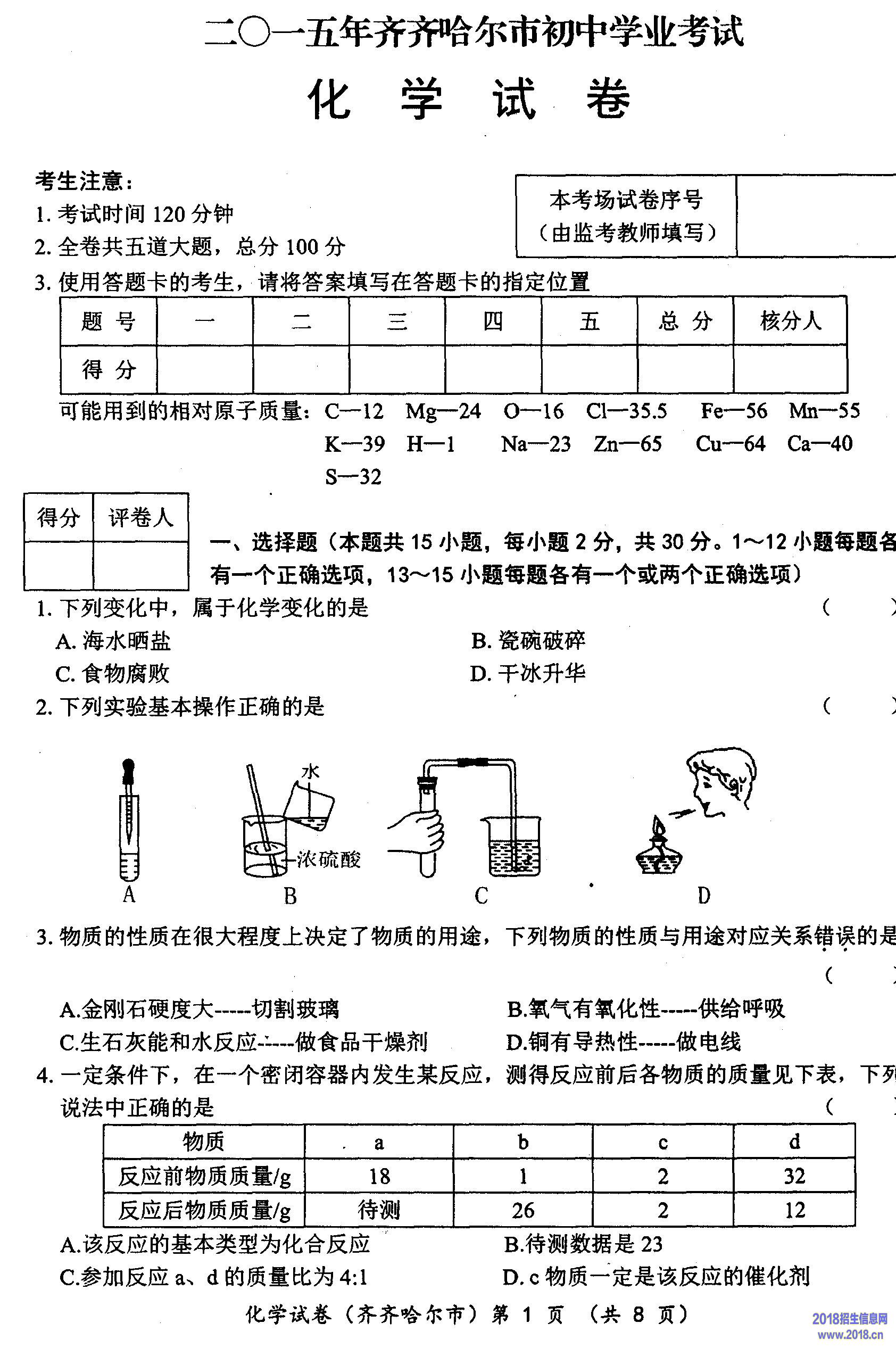 2015年黑龙江齐齐哈尔中考化学试题(图片版)