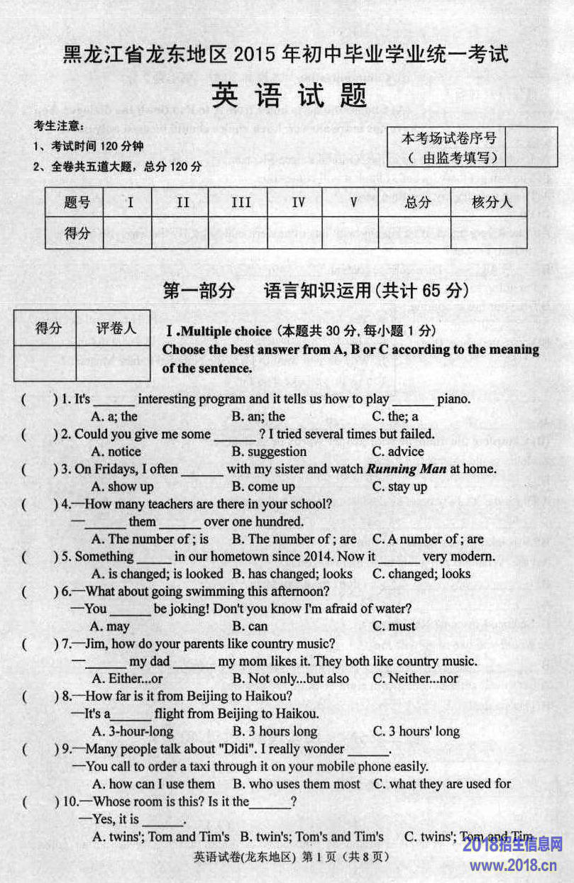 2015年黑龙江省龙东地区中考英语试题(扫描版,含答案)