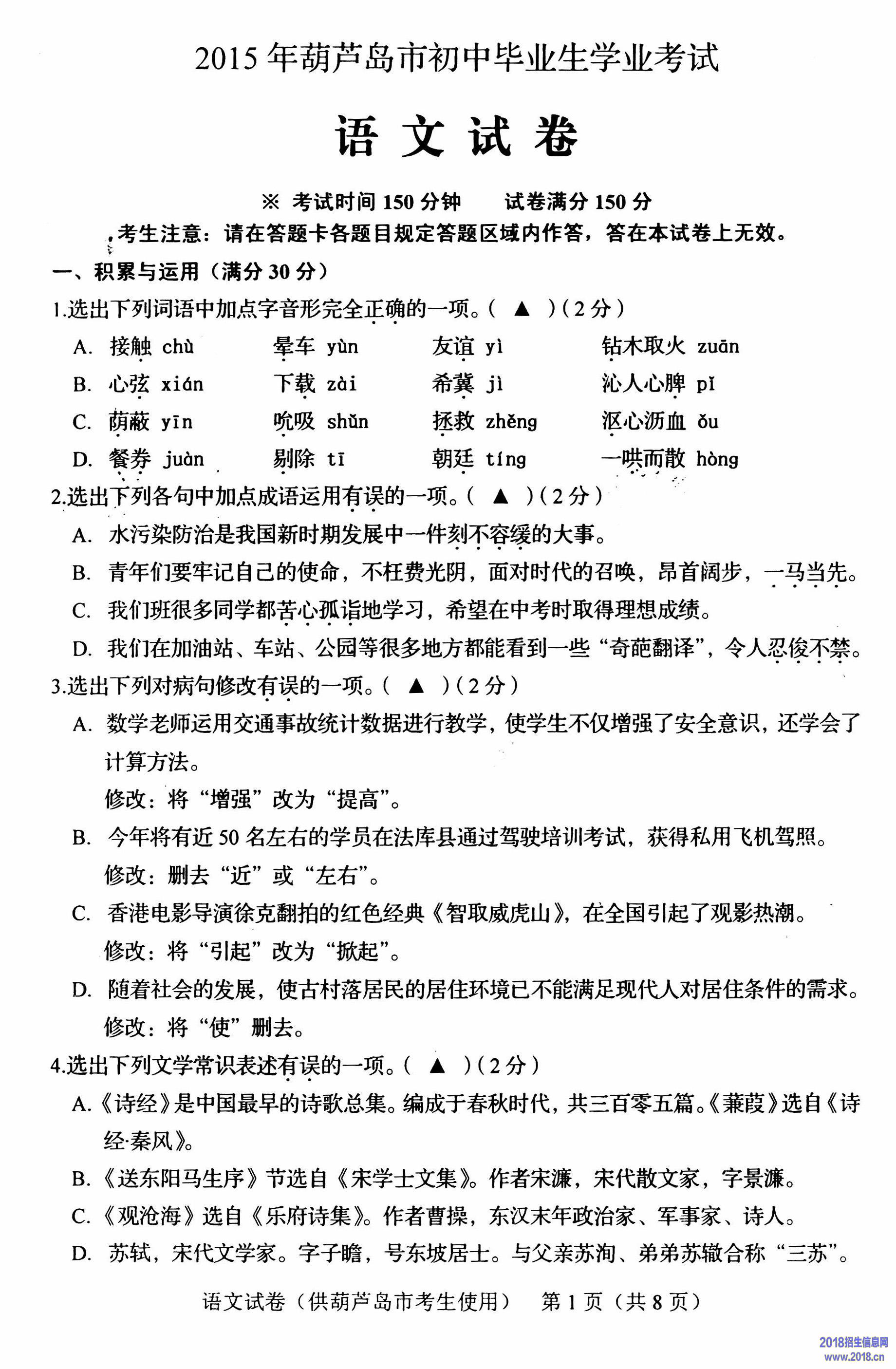 2015年辽宁省葫芦岛市中考语文试题(扫描版,含答案)