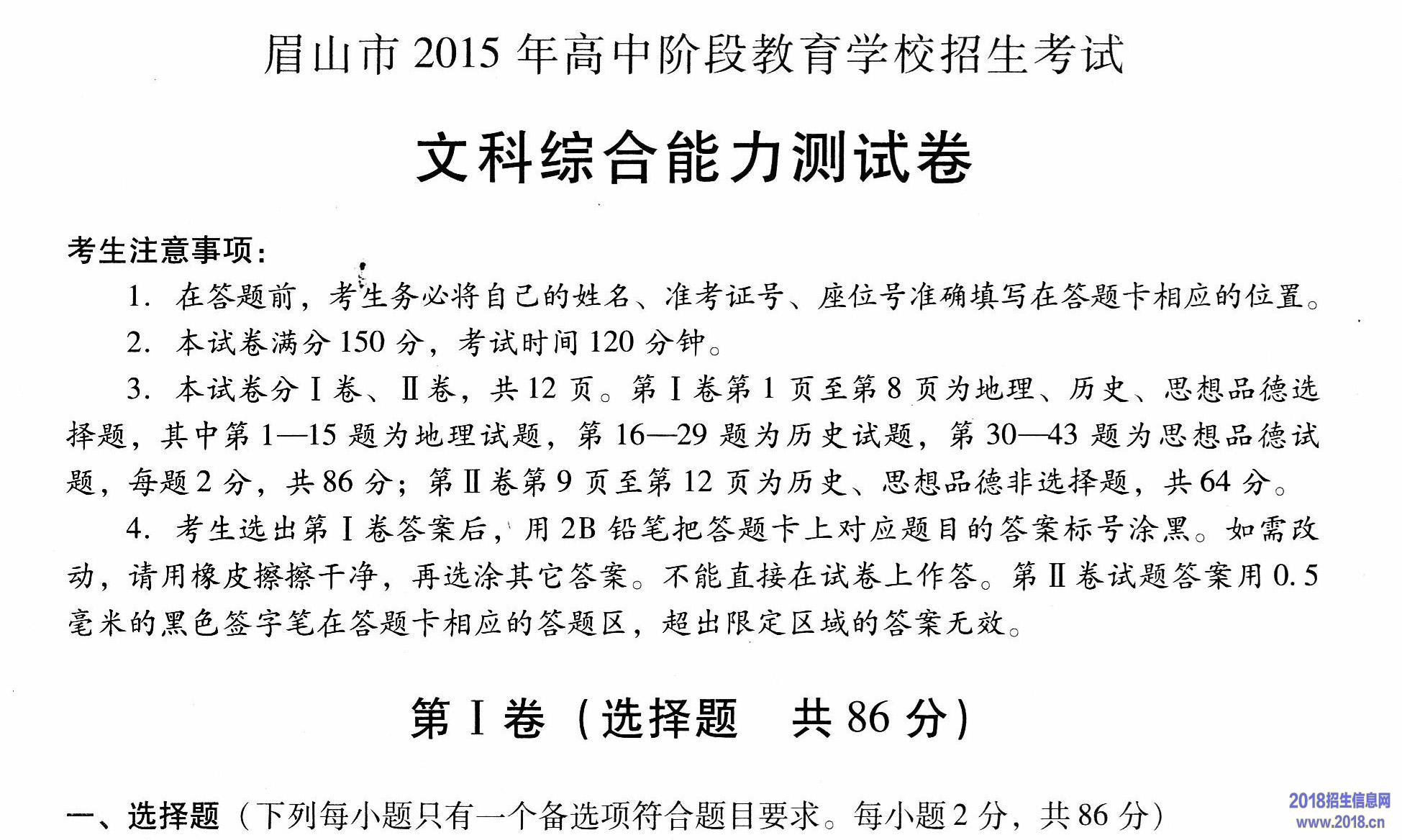 2015年四川省眉山市中考文综(政治部分)试题(扫描版,含答案)