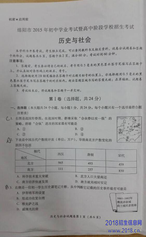 2015年四川省绵阳市中考历史与社会试题(扫描版,含答案)