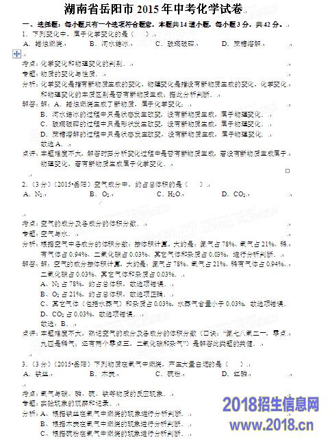 2015年湖南岳阳中考化学试题及答案(图片版)