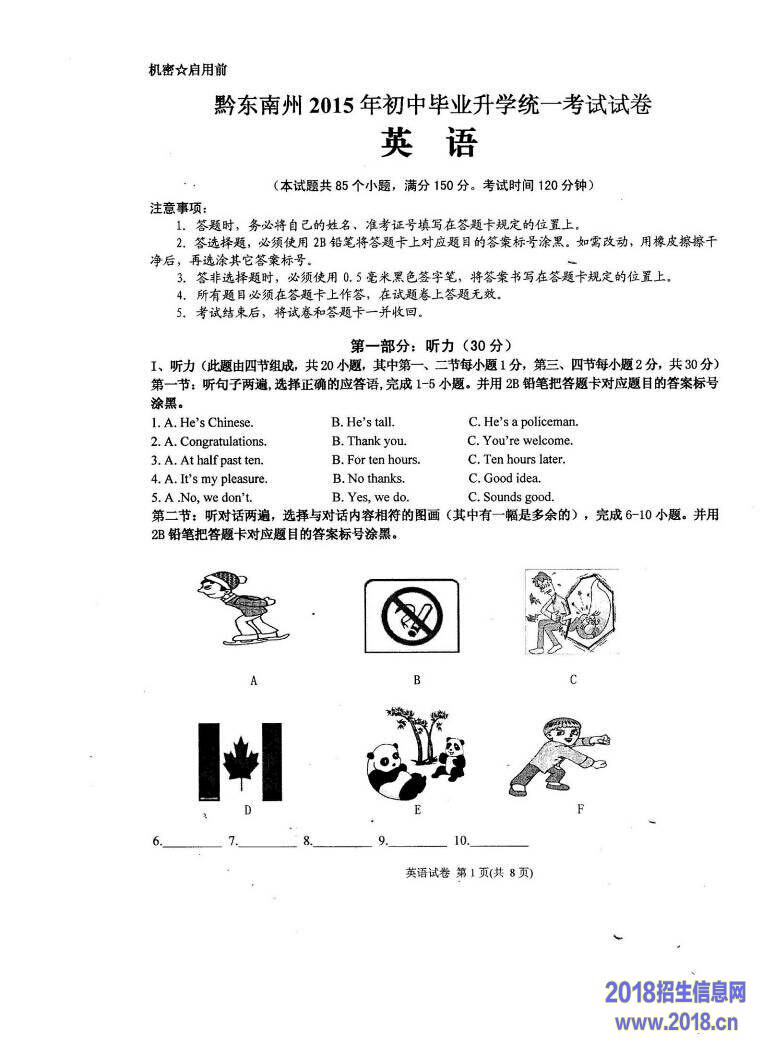 2015年贵州黔东南中考英语试题及答案(图片版)