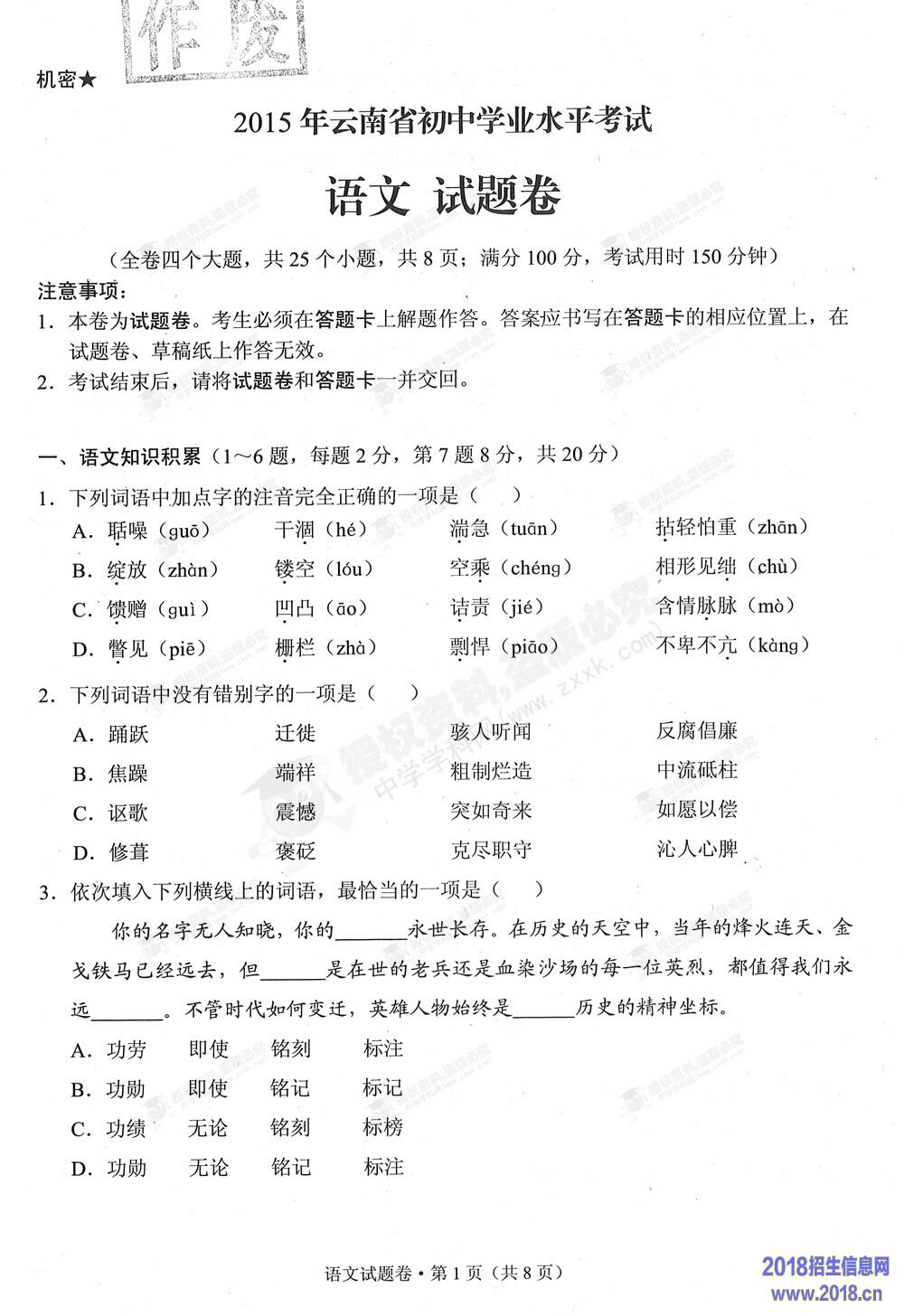 2015年云南中考语文试题及答案(图片版)