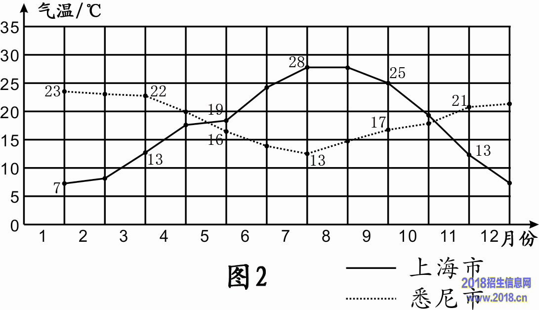 图2为上海和悉尼某年各月气温统计图。读图2,完成10~11题。