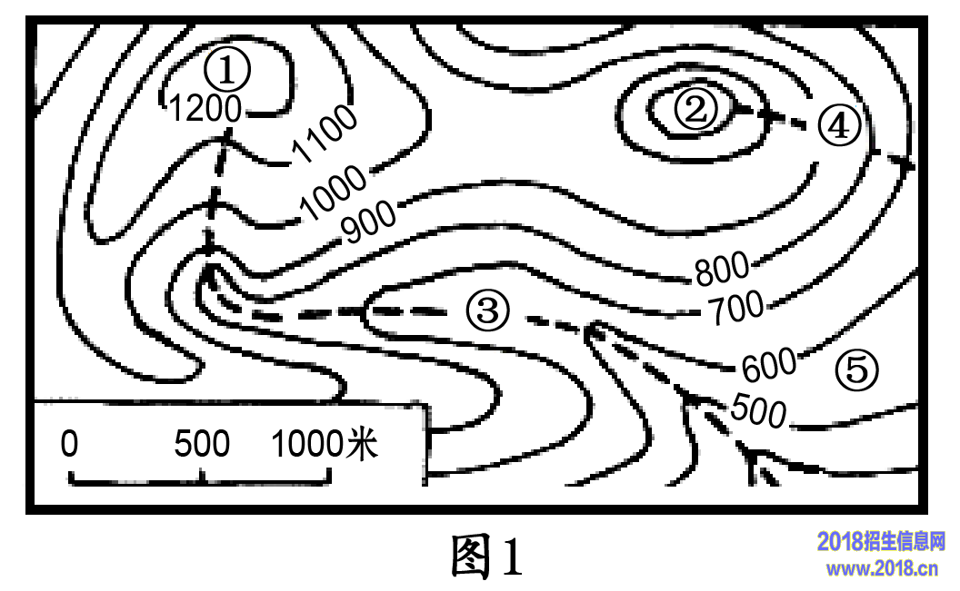 (1)从等高线地形图中可以得出,图5中①位于 (地形名称)内,其所在省(自治区)的简称是 。