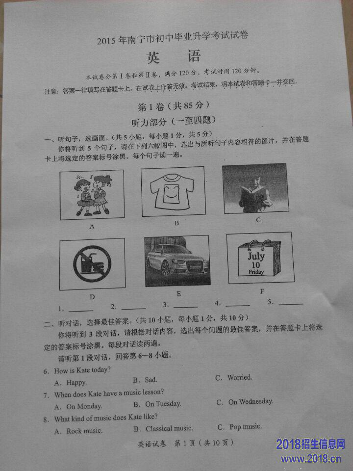 2015年广西南宁市中考英语试题(扫描版,无答案)