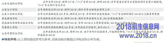 据悉,山东省从2013年开始试点“3+2”专科+本科分段教育培养模式,考生被“3+2”录取后,前3年在高职院校学习,考核合格后,进入本科院校再学习两年,毕业后即可获得本科学历。“今年‘3+2’对口贯通分段培养试点高职高专院校共有46所,共计75个专业点,衔接本科高校26所,培养规模4980人,比去年翻了一番。”省招考院相关负责人告诉记者,想上“3+ 2”,考生成绩要在山东省本科二批录取最低控制线下50分之内。