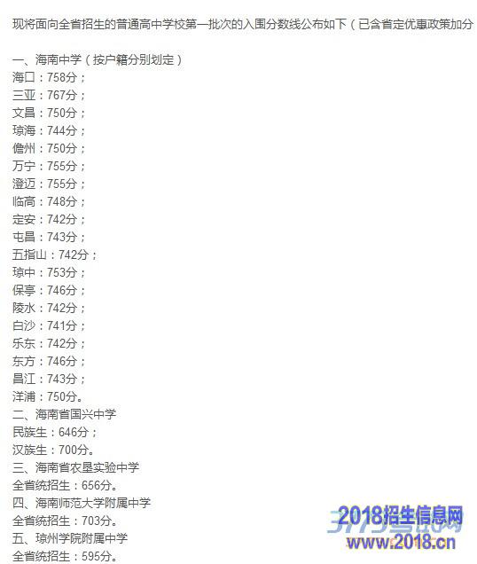 的普通高中学校第一批次的入围分数线公布如下(已含省定优惠政策加分):