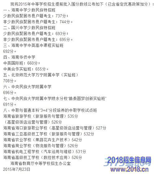 2015年海南省中等学校招生提前批入围分数线