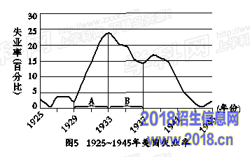 (2)据材料二,分别指出图5中A、B两个时段美国失业率的变化情况。分析导致这两个时段失业率变化的主要原因(提示:写重大事件名称)。(6分)