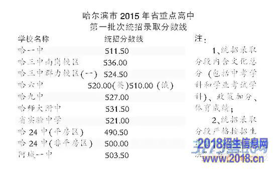 27日下午,哈市招考办公布2015年省重点高中第一批次统招录取分段,其中最高为哈三中南岗校区统招分段,为536分,比去年高了7.5分;最低为哈24中(平房区)的490.5分。据悉,今年的省重点一批次统招分数线均比去年有所提高,其中哈24中(非平房区)提高19.5分,省实验、阿城一中提高18分。该统招录取分段内含文化总分(包括中考学科和学业考试学科)、政策加分和体育成绩。