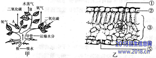 30.(5分)图甲表示植物的三种生理活动,图乙表示植物叶片结构,请据图回答下列问题: