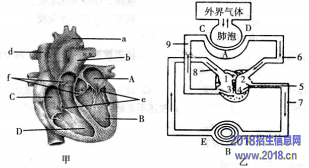 (1)图甲是人体心脏示意图,心脏结构中,心壁最厚的是 ,保证血液从心房流向心室的结构是 (填字母)。