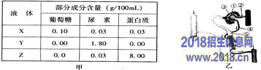 (2)图甲表格中,代表尿液的是 (填“X”或“Y”或“Z”),理由是 。