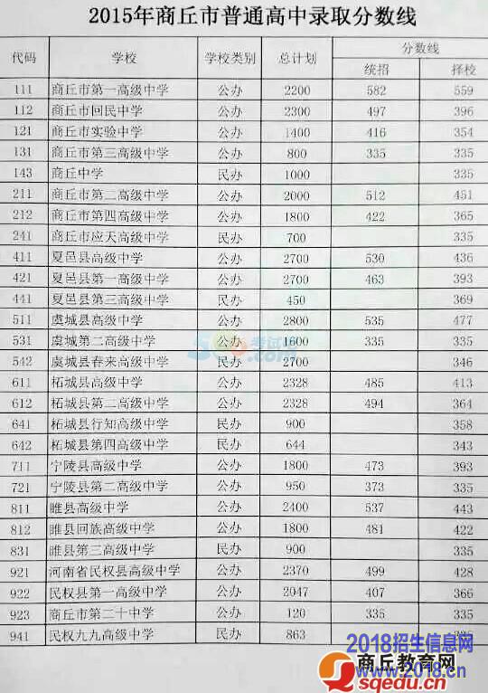商丘市2015年商丘市普通高中录取分数线公布,市直高中录取分数线: