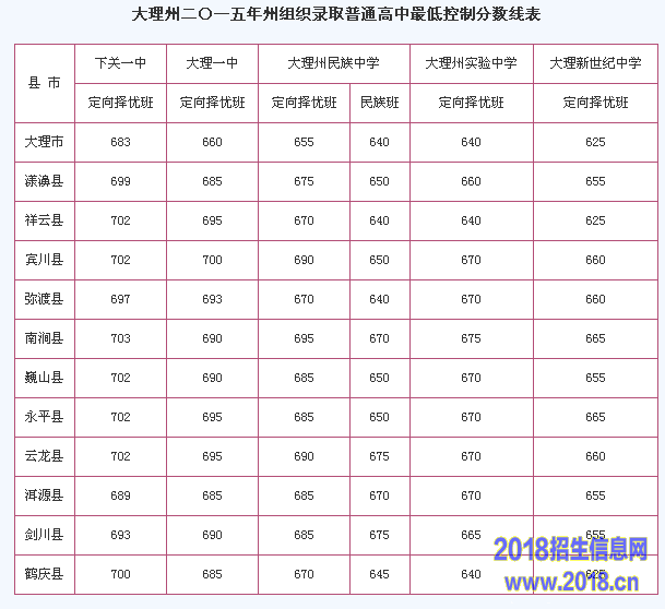 1、录取控制线:①大理州实验中学音乐班最低控制线文化分530分、专业分71分;美术班最低控制线文化分530分、专业分60分。②下关三中音乐班最低控制线文化分510分、专业分61分;美术班最低控制线文化分500分、专业分43分;体育班最低控制线文化分520分、专业分51分。③大理州体育职业中学高中体育班最低控制线文化分400分、专业分30分。