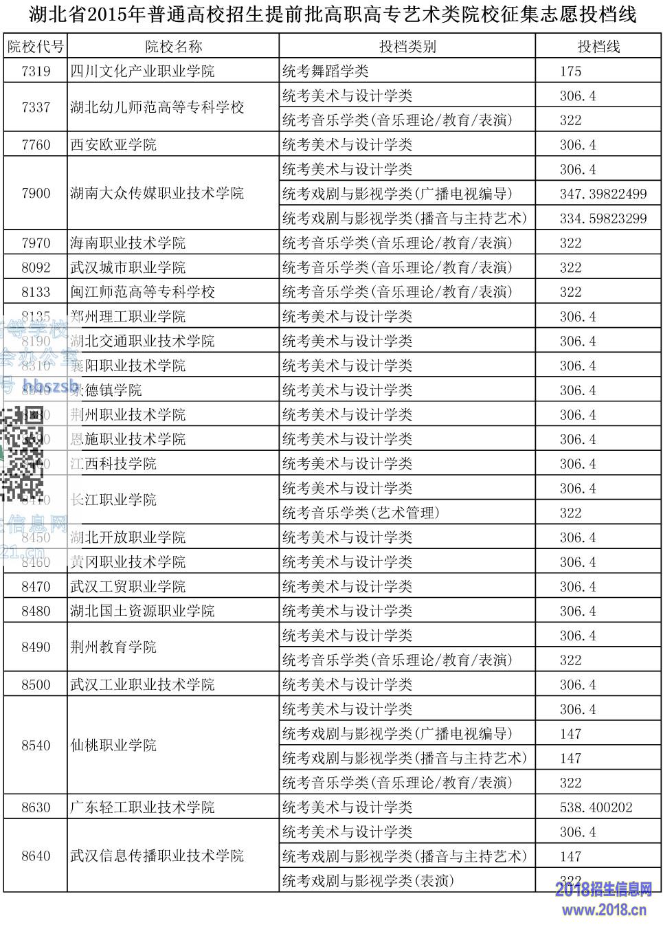 2015湖北高招提前批高职高专院校征集志愿投档线(艺术类)