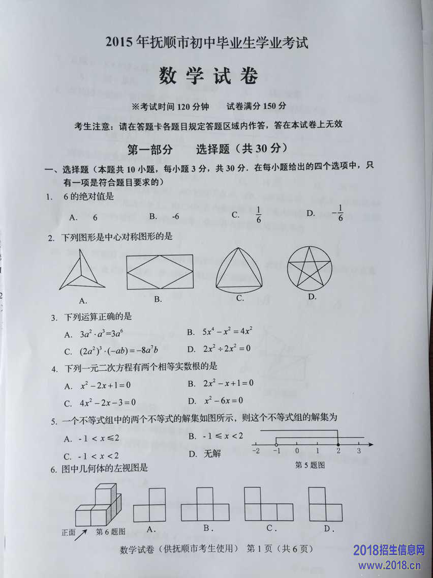 2015年辽宁省抚顺市中考数学试题(扫描版,含答案)