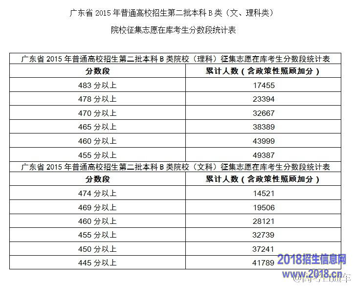 2015广东本2B院校征集志愿在库考生分数段排名统计表