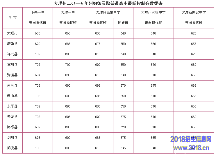1、录取控制线:①大理州实验中学音乐班最低控制线文化分530分、专业分71分;美术班最低控制线文化分530分、专业分60分。②下关三中音乐班最低控制线文化分510分、专业分61分;美术班最低控制线文化分500分、专业分43分;体育班最低控制线文化分520分、专业分51分。③大理州体育职业中学高中体育班最低控制线文化分400分、专业分30分。