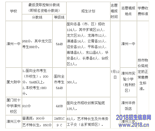 据了解,以上招生系漳州一中招收市直以外考生、漳州三中招收艺术特长生和外来务工子女(含芗城郊区),市直考生不能填报上述漳州一中面向外县(市、区)、漳州三中招收外来务工子女(含芗城郊区)招生计划。全市考生(含市直考生)均可填报厦大附中、厦门双十中学漳州校区创新实验班和漳州三中艺术特长生招生计划。漳州一中、漳州三中招收市直考生,志愿填报时间为7月13日-15日,志愿填报地点在考生毕业学校,7月20日经市招委会研究同意后,将公布两校录取分数线和录取考生名单。