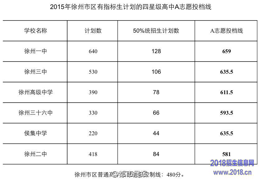 2015年徐州市区有指标生计划的四星级高中A志愿投档线公布,徐州一中659分