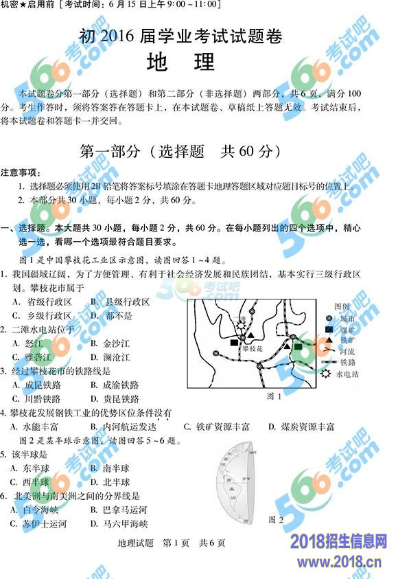 2015年四川攀枝花中考地理试题及答案(图片版)