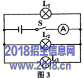 9.小明用如图3所示的电路图研究并联电路电流的规律,当闭合开关S试触时,发现3只小灯泡均发光,电流表的指针正向偏转并超过最大刻度。产生这种现象的原因可能是