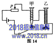 25.在探究“影响电磁铁磁性强弱的因素”实验中,小明用铁钉制成简易电磁铁甲、乙,并设计了如图14所示的电路。[来源:学+科+网Z+X+X+K]