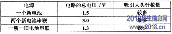 (3)实验结束后,小明发现电池使用说明中有一条提示:“请一次性更换所有电池,以免新旧电池混用”。他想新旧电池混用和不混用有什么区别呢?于是,他做了如下探究,他用一节新电池代替图14中原来的电源,闭合开关后,用电压表测出电路的总电压,并观察电磁铁吸引大头针的数量,记录在下表中,然后再分别把两个新电池、一新一旧电池串联起来,替换原来的电源,重复上述实验,实验记录如下表所示。