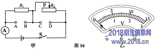 (3)现把一个表盘如图16乙所示的电压表接入电路中,要求在移动滑动变阻器滑片P的过程中电压表指针偏转角度变化最大。