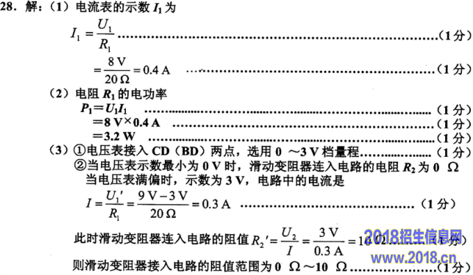 28.在图16甲所示的电路中,电源电压为9V且保持不变,电阻R1的阻值为20Ω,滑动变阻器R2上标有“40Ω 1A”字样,闭合开关S,当滑动变阻器R2的滑片P移到某位置时,R1两端的电压为8V。