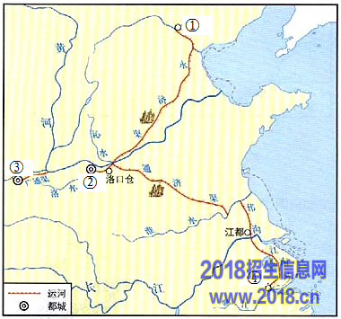 (2015·广东深圳)6.据史书记载,大运河开通后,洛阳城店铺云集,商业繁荣。图2中哪一序号表示洛阳城的位置( )
