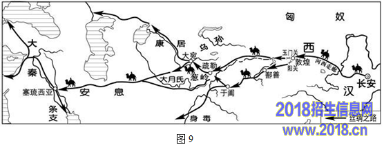 问题一:图9中字母A处是当时哪座城市?(1分)西汉末年,由丝绸之路传入中国的是哪一宗教?(1分)这一时期,还开通了哪一条海上交通要道?(1分)