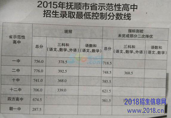 2015年抚顺中考省示范性高中录取分数线公布