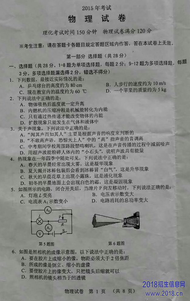 2015年辽宁省锦州市中考物理试题(扫描版,答案不全)