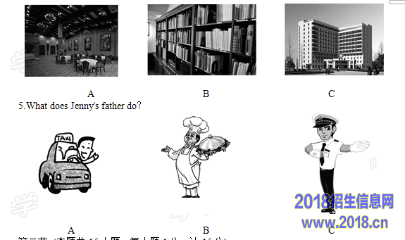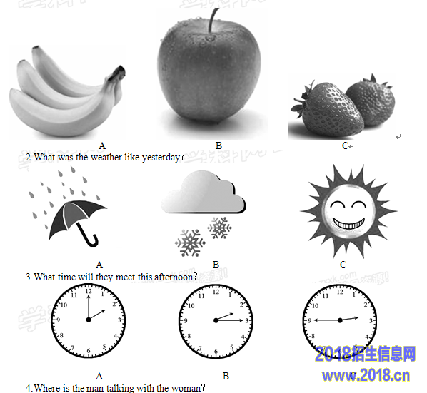 听下面五段对话,每段对话后有一个小题,从题中所给的A、B、C三幅图片中选出最佳选项,并将机读卡上对应题号的答案标号涂黑。听完每段对话后,你将有5秒钟的时间来回答有关小题和阅读下一小题。每段对话读两遍。