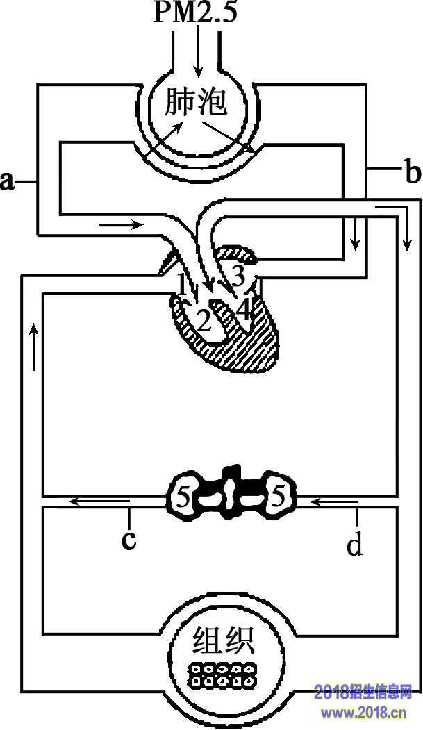 51.(5分)PM2.5是指大气中直径等于或小于2.5微米的颗粒物,也称为可入肺颗粒物。它可通过呼吸系统进入血液循环系统,对人体造成危害。请据图分析。