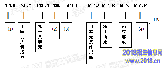 (2)材料二是中国历史发展某阶段的基本线索示意图。请分别指出①②③④四处序号相对应的重大历史事实,并简要分析第③序号对应历史事实的意义。(6分)