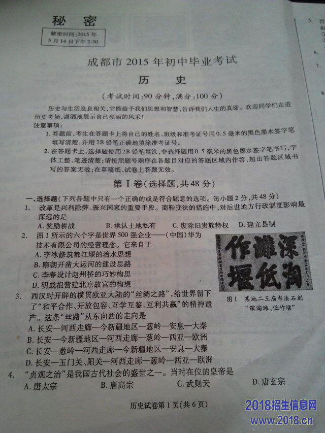 2015年四川省成都市中考历史试题(扫描版,含答案)