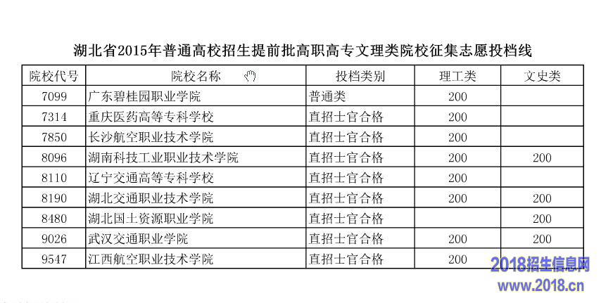 2015湖北提前批高职高专文理类院校征集志愿投档线