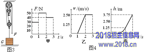 7. 为了将放置在水平地面上重为100N的物体提升一定高度,设置了图3所示的滑轮组装置。当用图4甲所示随时间变化的竖直向下的拉力F拉绳时,物体的速度v和物体上升的高度h随时间变化的关系分别如图4乙和丙所示。(不计绳重和绳与轮之间的摩擦)下列计算结果正确的是( )