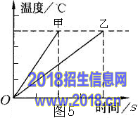 ⑶ 图5是甲乙两种液体的温度随时间变化的关系图像。若将液体甲和液体乙加热相同的时间,则液体 温度升高得快,甲乙两种液体的比热容的大小关系是c甲 c乙。