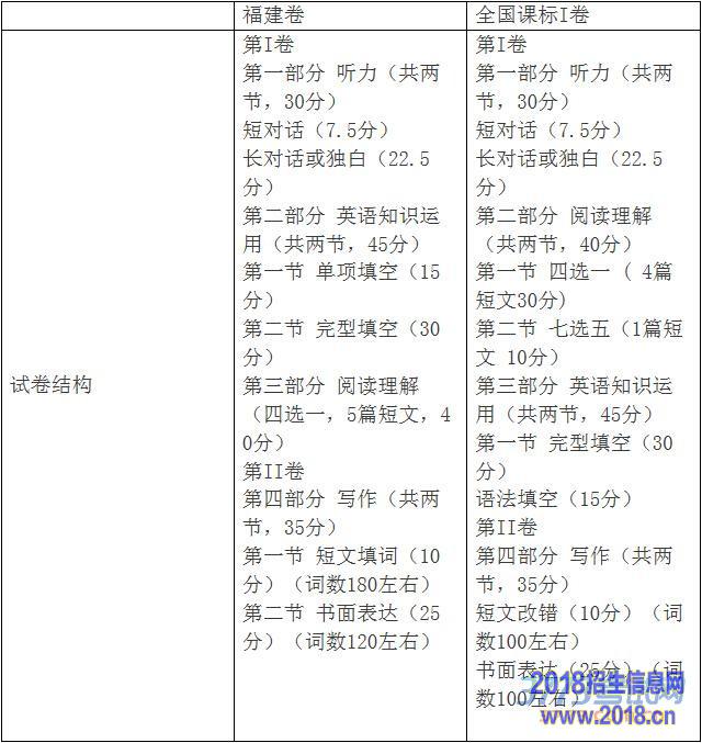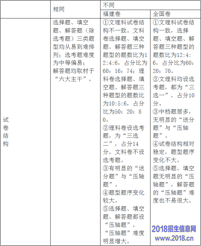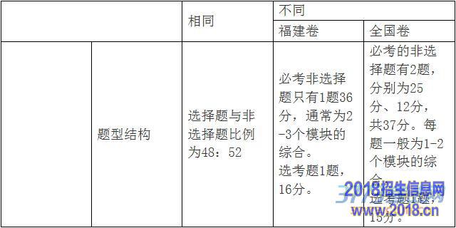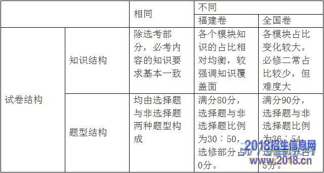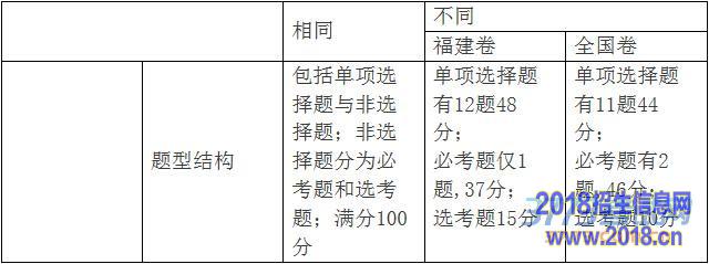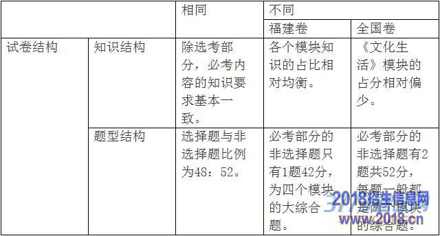全国卷的试题内容和结构与福建卷基本一致。差异主要在于:全国卷没有选考模块,增加了必考模块的考点,此外,全国考纲共有32个考点以往福建没有要求;全国卷更加重视学科理论思维和抽象思维能力,福建卷则突出综合分析能力和实际生活参与能力;全国卷模块之间的综合性要求较低,没有四个必修模块知识的大综合试题;文综卷中学科试题顺序略有不同,全国卷试题按地理、政治、历史排序,福建卷试题按地理、历史、政治排序。
