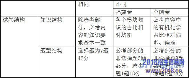 选修模块全国卷为《物质结构与性质》、《有机化学基础》和《化学与技术》三选一,福建卷为《物质结构与性质》和《有机化学基础》二选一。此外,全国卷提高了模块的选择性,对思维能力和思维品质、化学实验与探究能力以及必考内容中的有机化学内容要求较高。