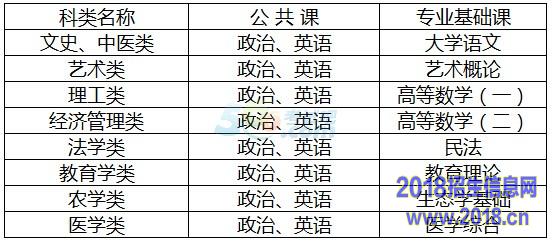 (三)专升本考试统考科目均为三门。两门公共课为政治、英语,一门专业基础课根据招生专业所隶属的学科门类确定。