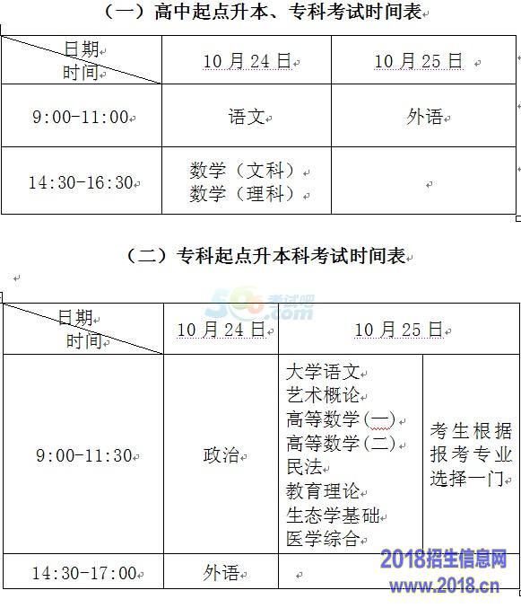2015年成人高等学校高起本、高起专和专升本招生全国统一考试时间为10月24日、25日(星期六、星期日)。