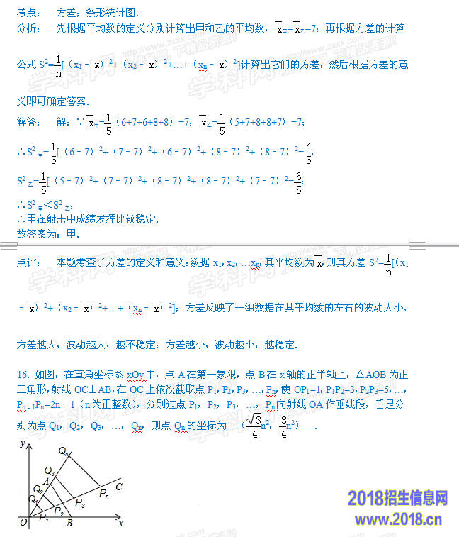 16.如图,在直角坐标系xOy中,点A在第一象限,点B在x轴的正半轴上,△AOB为正三角形,射线OC⊥AB,在OC上依次截取点P1,P2,P3,…,Pn,使OP1=1,P1P2=3,P2P3=5,…,Pn﹣1Pn=2n﹣1(n为正整数),分别过点P1,P2,P3,…,Pn向射线OA作垂线段,垂足分别为点Q1,Q2,Q3,…,Qn,则点Qn的坐标为 .